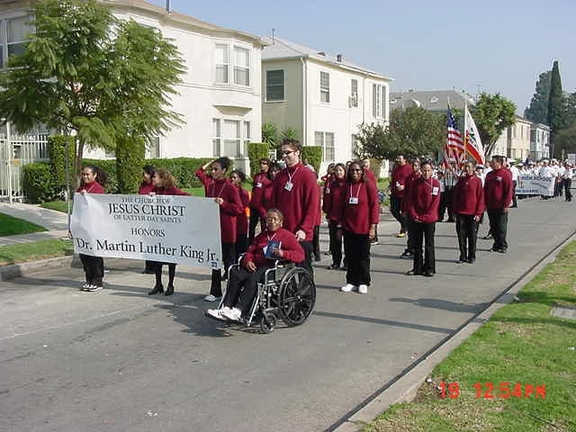 Church history was surely made in Southern California this past week, when members of the LDS church were seen marching down Crenshaw Blvd “The Shaw”, for the annual Kingdom Day Parade, celebrating the birth of Martin Luther King, Jr. Approximately 30 members, mostly of African American descent, dressed uniformly in burgundy sweaters and black pants or skirts, walked confidently through the streets of South Central. This area of Los Angeles is highly known for gang related activities, yet on this day there was no evidence of such goings-on, just the excitement and fascination of enthusiastic people of all cultures there to see celebrities, marching bands, floats, and various organizations representative of their community.